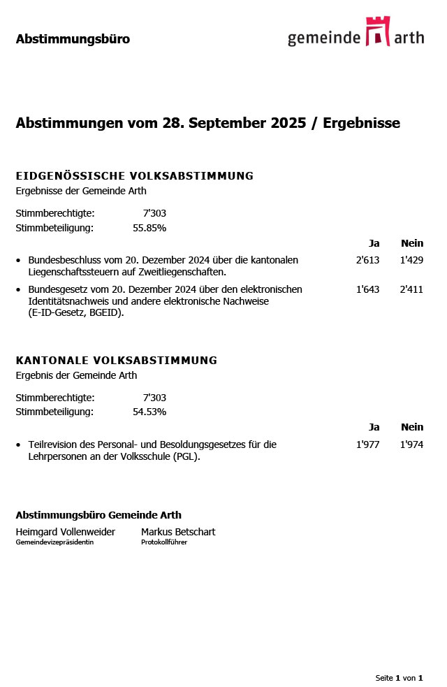 Abstimmungsresultate Gemeinde Arth vom 28. September 202528.09.2025Publiziert von Daniel Annen Hinterlasse einen Kommentar Abstimmungsresultate Gemeinde Arth vom 15. Mai 2025