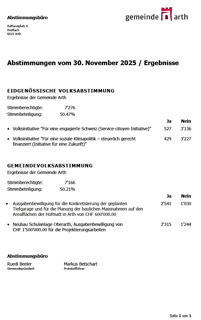 Abstimmungsresultate Gemeinde Arth vom 30. November 202530.11.2025Publiziert von Daniel Annen Hinterlasse einen Kommentar Abstimmungsresultate Gemeinde Arth vom 30. November 2025