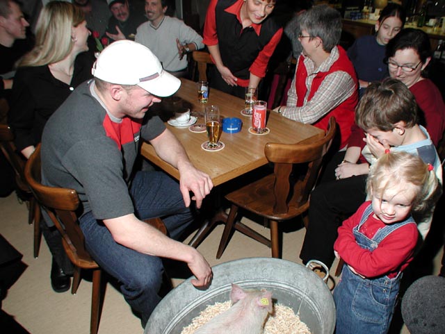 Glücksschwein Glücksbringer für die Olympiade in Salt Lake 2002 Weitere Auflösungen zum Herunterladen: 900 x 900 (87 KB)/ 1200 x 1200 (167 KB) MDL/SL - Der Annen Fan Club überreicht Martin Annen bei einer kleinen Weltcup-Feier - am Sonntagabend - bei «Casi» (Fam. Werner Casagrande-Herger) im Gasthaus Schützenhaus in Goldau, ein Glücksschwein als Glücksbringer für die Olympischen Spiele, in Salt Lake City. Der Olympiateilnehmer « Märtl » (Bild mitte) zeigt stolz sein Glückssäuli. Martin, Dir und Deinem Team viel Glück und ...